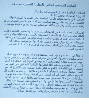فجّرت ساندي مفاجأة في المؤتمر الذي أقامته أمس في فندق الفور سيزون بحضور الفنان مصطفى كامل رئيس لجنة العمل بنقابة الموسيقيين، وذلك بعدما أذاعت تسجيلاً للسيدة مريم عثمان رئيسة مركز راشد لرعاية الطفولة في دبي وهي تؤكد أن الفنانة نوالالزغبي هدّدت بالانسحاب من الحفل في حال صعود ساندي للمسرح ورفضت مشاركتها لها.